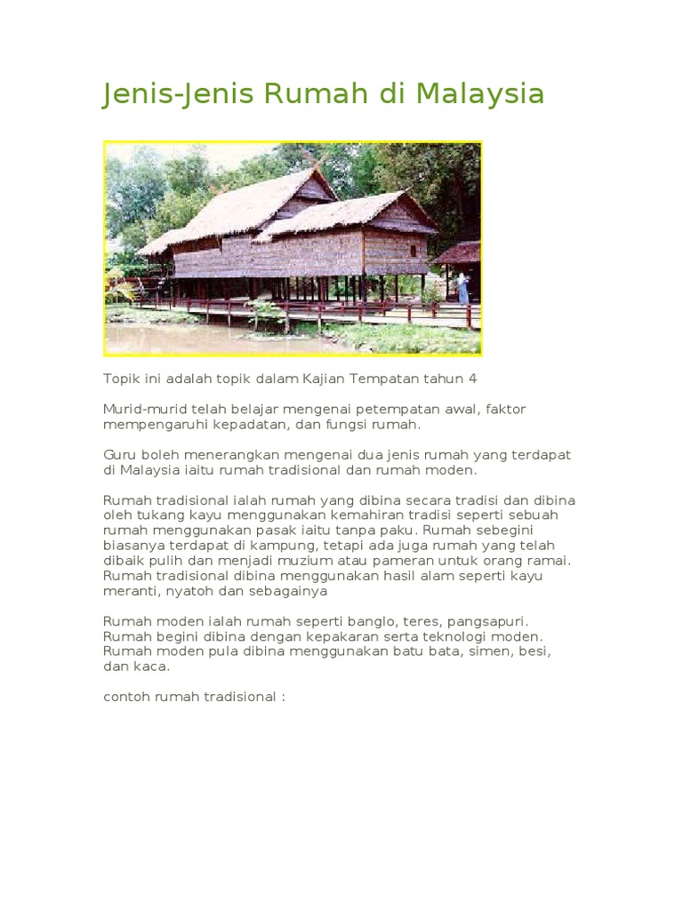 Contoh Karangan Rumah tradisional Melayu adalah antara senibina terawal yang merupakan tempat kediaman tradisional masyarakat penduduk asal etnik Melayu di Semenanjung Tanah Melayu Singapura Sumatera dan Kalimantan. Rumah-rumah tersebut berjajar di antara jalan kampung yang tidak terlalu lebar. 81 21 81 menganggap dokumen ini bermanfaat 21 suara 49K tayangan 12 halaman.